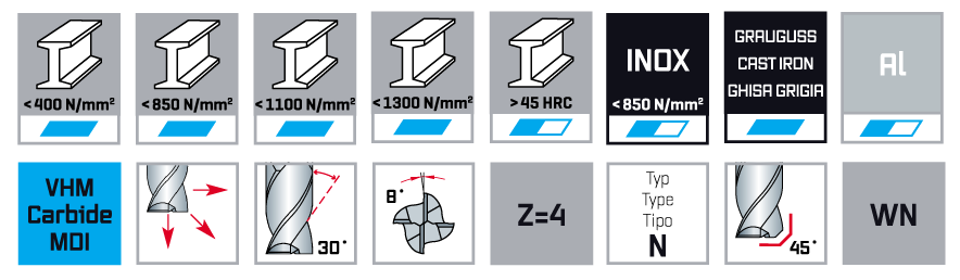 Твердосплавные концевые фрезы укороченной серии, четырехзубые. Подходят для фрезерования материалов средней и высокой прочности. Фрезерование глубоких пазов с точными посадками, а также для торцевого и тангенциального фрезерования. Высокая производительность, бесшумность обработки, превосходное качество поверхности.