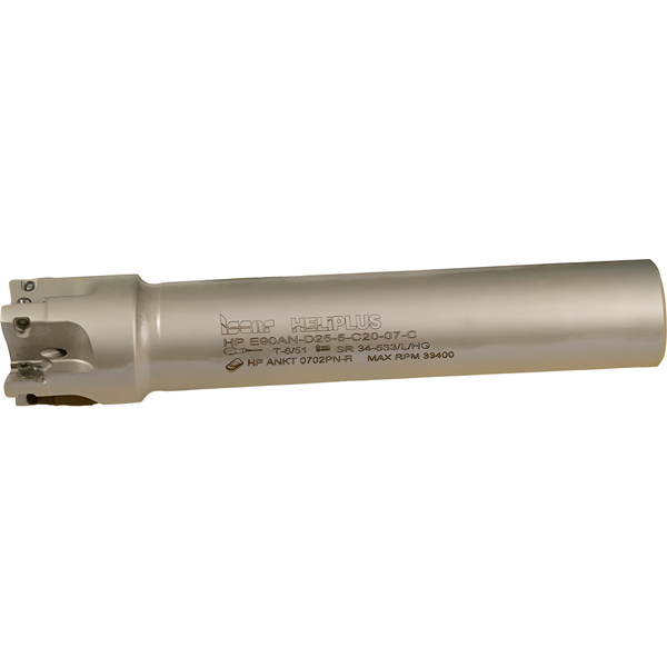 Концевая фреза с использованием HELIPLUS HP, с очень мелким шагом и очень жесткими допусками на инструмент и пластину для высокой производительности. Очень прочная и долговечная вставка.