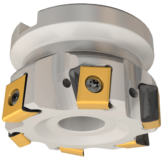 Торцевая фреза, на которых установлены пластины с тангенциальным зажимом и 4 спиральными режущими кромками длиной 13 мм.