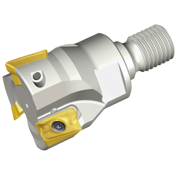 Модульная концевая фреза под углом 90° с адаптацией T-FLEXTEC и двумя спиральными режущими кромками пластин с высоким положительным наклоном.
