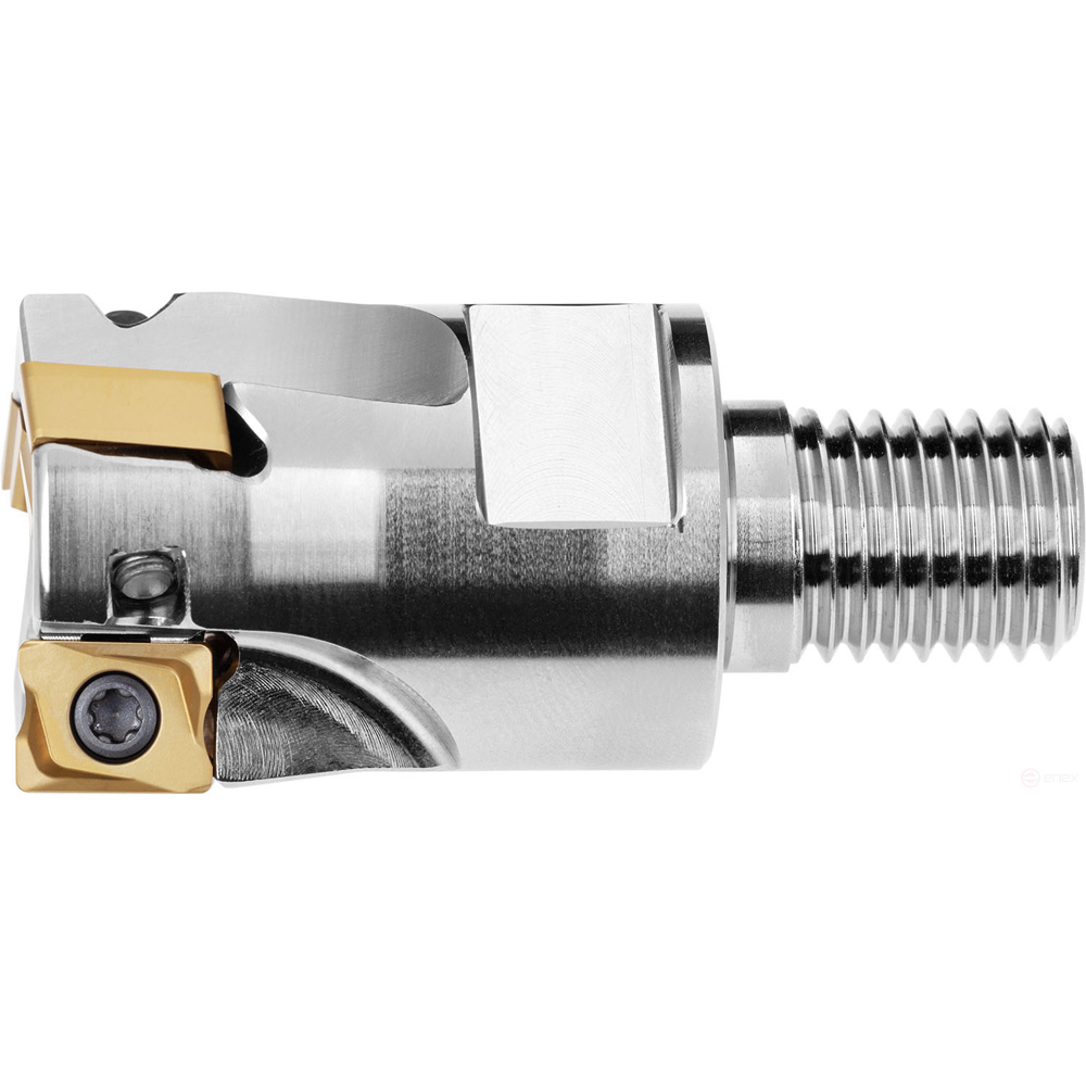 Фреза для обработки уступов с двойной негативной геометрией, количество зубьев 3, диаметр фрезы от 40 мм с 90° углом в плане и M16 хвостовиком с резьбой для стандартных оправок под сменные головки, 43 мм вылет, внутренний подвод СОЖ для неглубокого фрезерования карманов и уступов, неглубокого фрезерования пазов и плунжерного фрезерования с максимальной глубиной резания 9.0 мм.