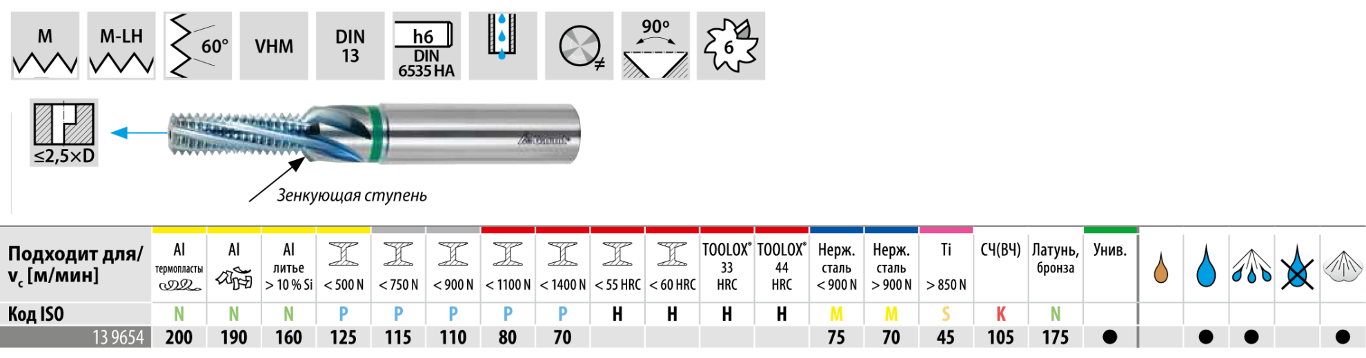 Твердосплавная резьбовая фреза с неравномерным шагом зубьев и увеличенным числом зубьев. За счёт неравномерного шага зубьев достигаются низкие биения и высокая стойкость режущего инструмента. Новая универсальная геометрия и высокоэффективное покрытие для обработки самых разных материалов.