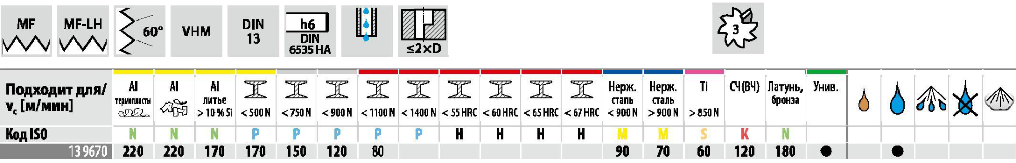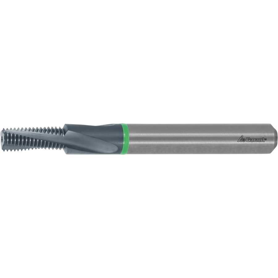 Цельная концевая резьбовая фреза из мелкозернистого твёрдого сплава с внутренними каналами для подвода СОЖ. Корригированный профиль резьбы для фрезерования точной внутренней резьбы при наличии стабильных условий работы.
