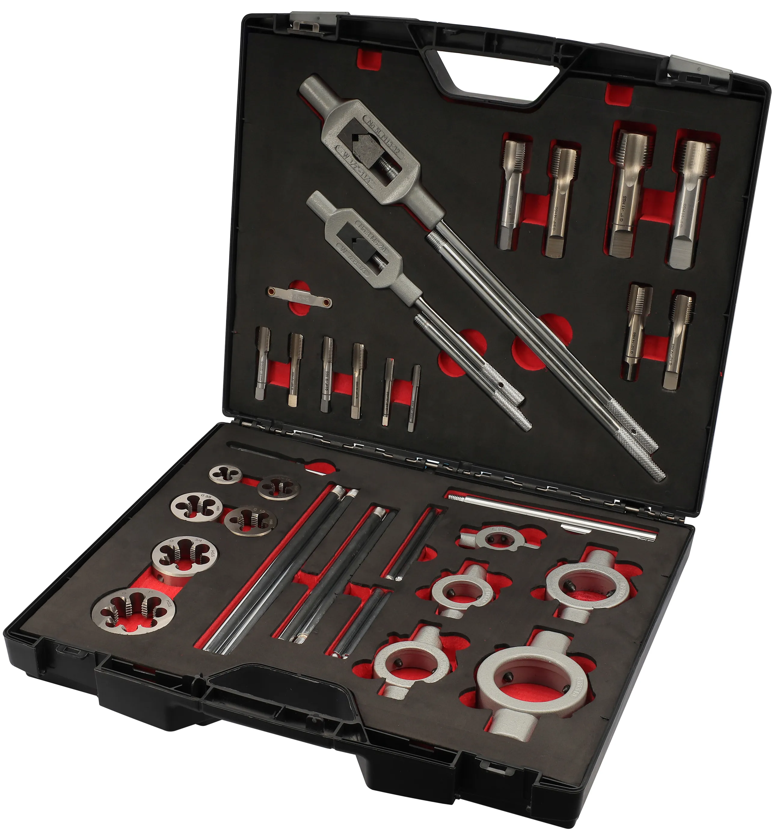 Метчики и плашки изготовлены из высококачественной быстрорежущей стали HSS, которая гарантирует прочность и износостойкость. Подходит для обработки заготовок, выполненных из легированной стали, чугуна, алюминия, меди, бронзы, цинка, с пределом прочности до 800MPa.