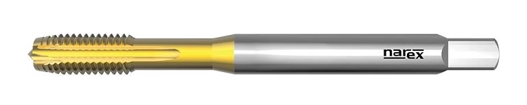 Машинный метчик с прямыми канавками и спиральным наконечником, метрический, DIN 371, с TiN-покрытием, подходит для конструкционных сталей, литейных сталей, легкорежущих сталей; возможно применение при коротком стружкообразовании для медных сплавов, чугуна с шаровидным графитом и ковкого чугуна, алюминиевых сплавов с содержанием Si <10 %.