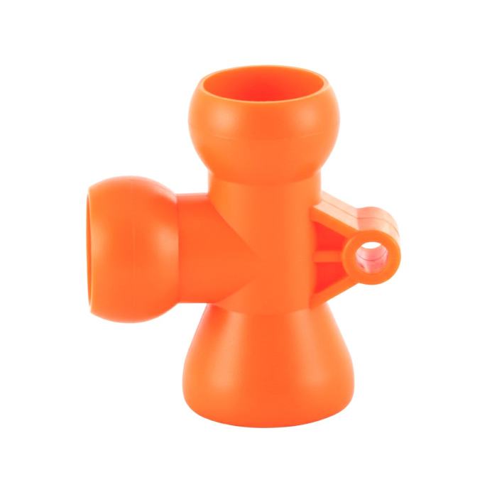 Конструкция переходника включает шарнирное крепление, рассчитанное на одну трубку диаметром 1/4" и две трубки диаметром 1/4", а также монтажное ухо для фиксации. Этот тройник позволяет формировать различные конфигурации модульной системы подачи СОЖ, обеспечивая эффективное разделение потоков жидкости или газа.