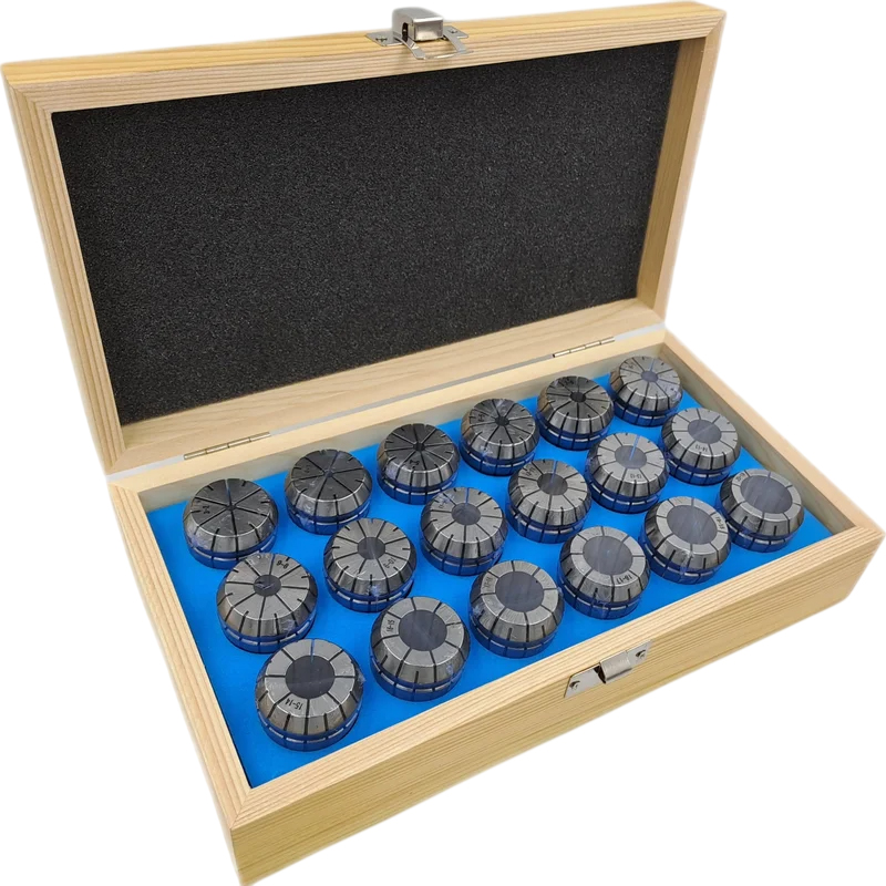Цанги ER изготовлены из специального эластичного стального материала 65Mn. Мощная фиксация, высокая точность. Используется для растачивания, фрезерования, сверления, нарезания резьбы, шлифовки, гравировки и т. д. Точность биения: 0,008 мм. В комплекте 18 цанг размером от 3 до 20 мм.