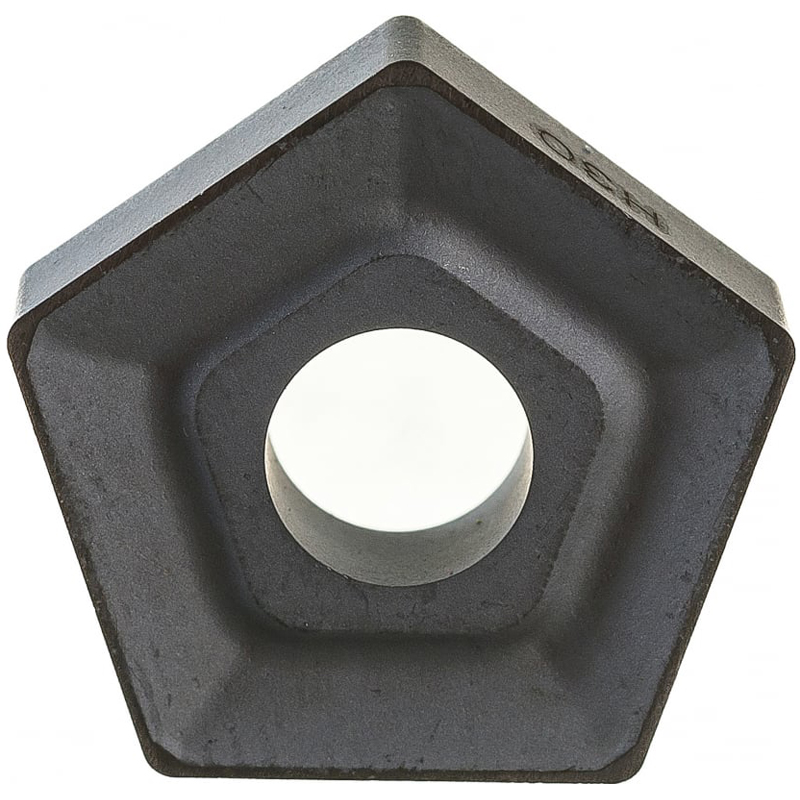 Для закрепления твердосплавных пятигранных пластин с цилиндрическим отверстием используют рычажный метод, т.н. механическое крепление режущих пластин. Использование твердосплавных сменных пластин является существенным способом экономии денежных средств предприятиями металлообрабатывающей промышленности, так как инструмент, изготовленный из менее прочных и потому более дешевых сталей, со сменными твердосплавными пластинами, существенно дешевле монолитного твердосплавного. Изготавливаются пластины по ГОСТу 19065-80 из твердых сталей марок B35 (современный аналог сплава ВК8), H30 (современный аналог сплава Т5К10) и H10 (современный аналог сплава Т15К6) и обозначаются PNUM, PNMM.
