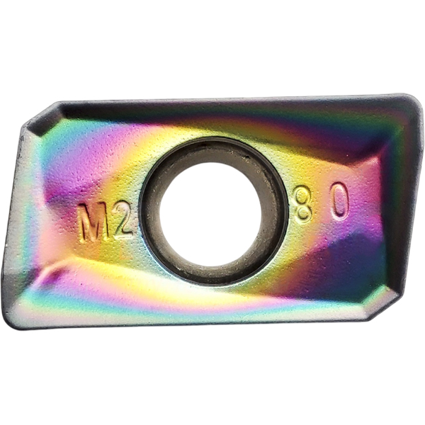 Твердый сплав на основе вольфрама c PVD покрытием. Покрытие - цветное (AlTiCrSiN). Условия резания плавные.