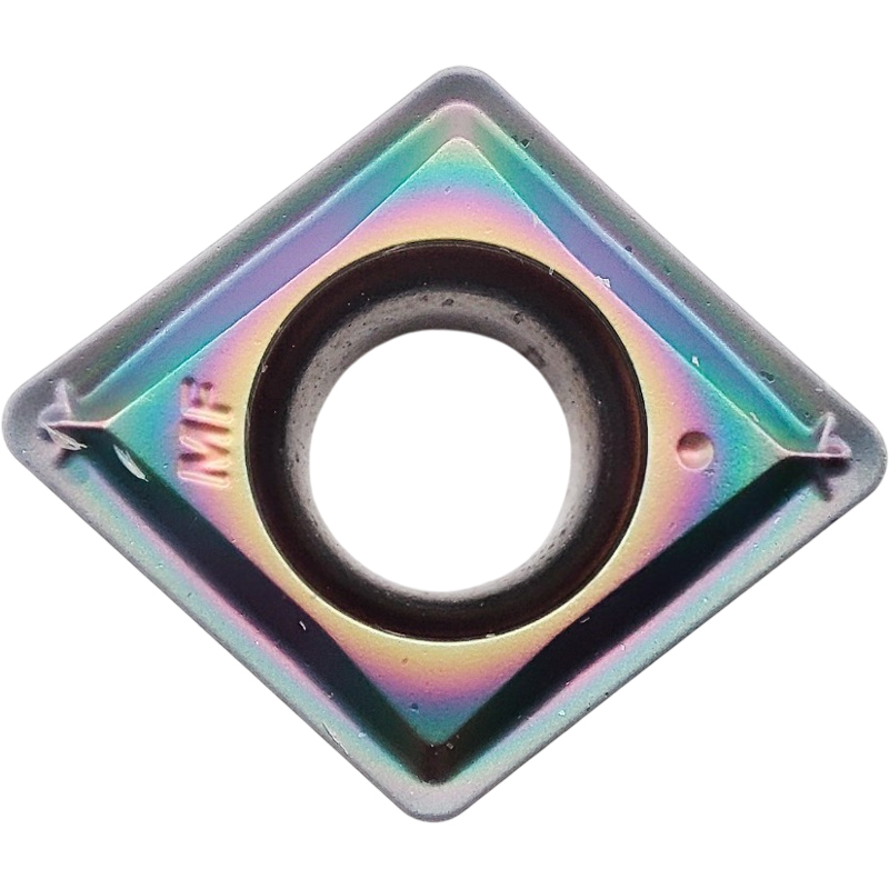 Твердый сплав на основе вольфрама c PVD покрытием. Покрытие - цветное (AlTiCrSiN). Условия резания плавные.